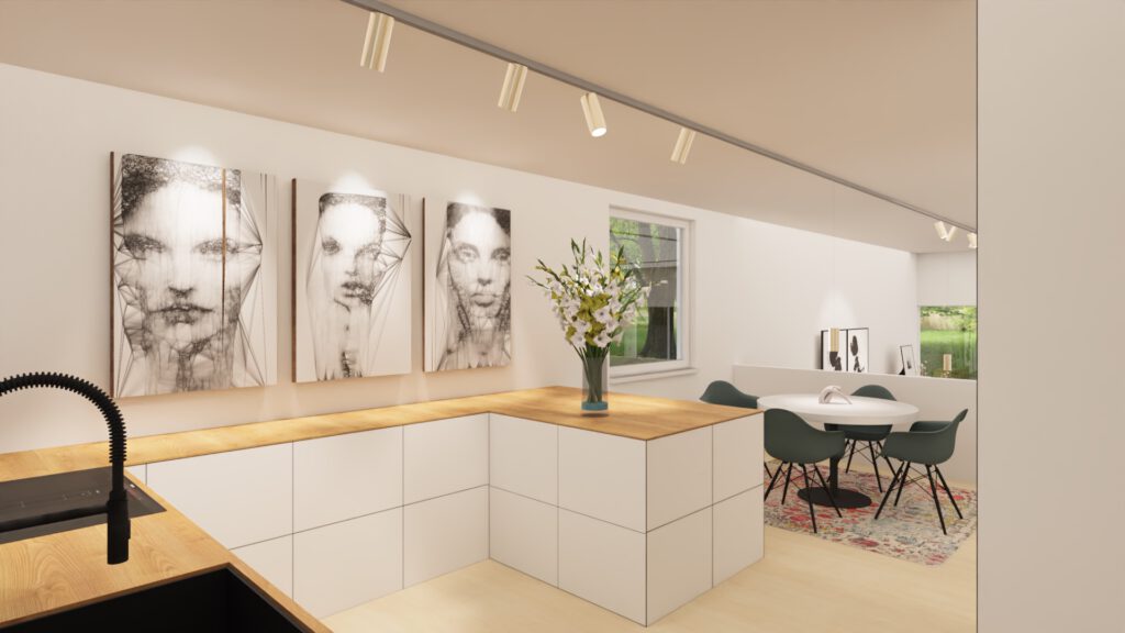 Bei diesem Projekt habe ich die Neugestaltung der offenen Küche mit angrenzendem Essbereich und einem großzügigen Wohnbereich entworfen und umgesetzt.