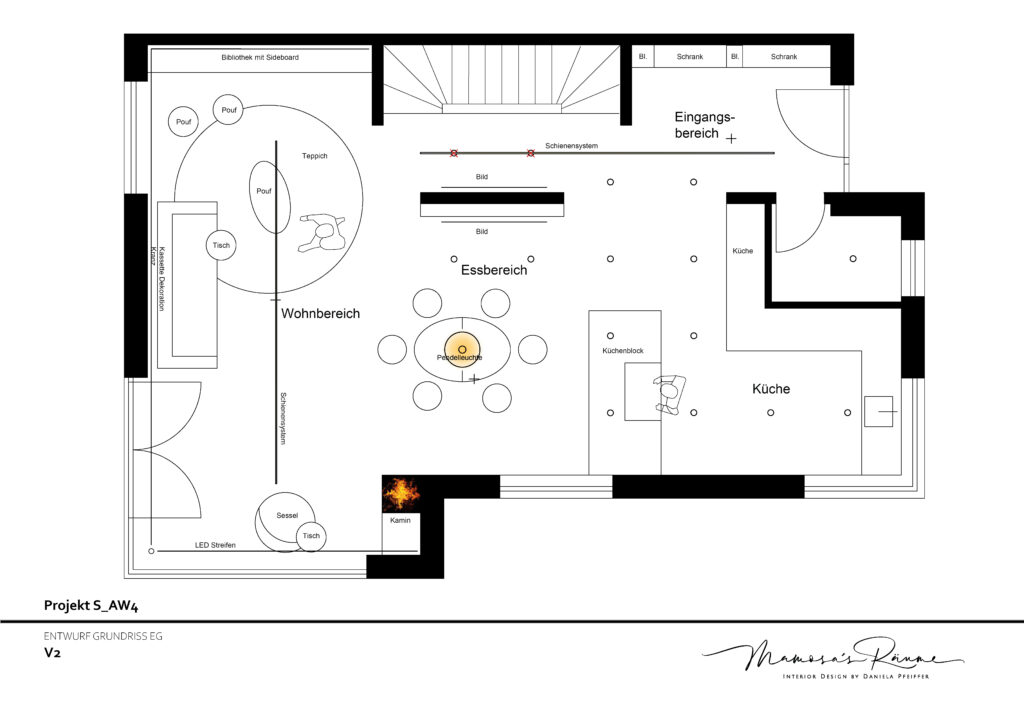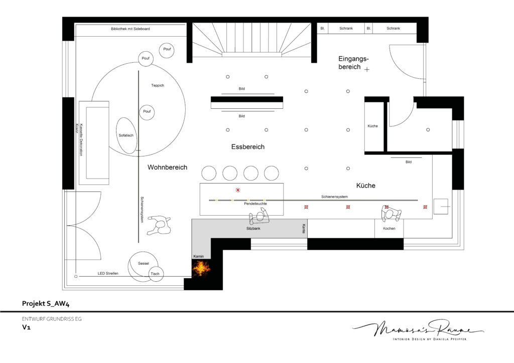 Im Projekt Steinbach wurde ich beauftragt die Möblierungsplanung des kompletten Erdgeschosses mit Wohn- und Essbereich und offener Küche sowie dem Bad im Obergeschoss zu übernehmen.