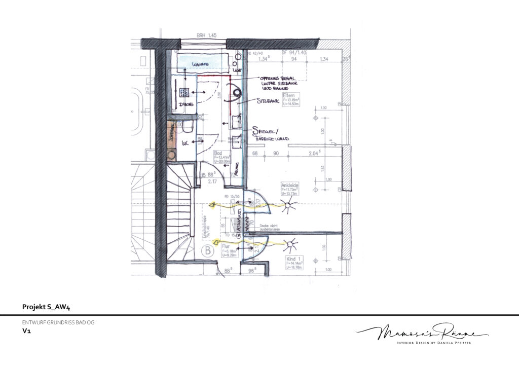 Dem Bad im Obergeschoss habe ich mit meiner Planung eine ruhige Ordnung und einen Wohlfühlcharakter gegeben.
